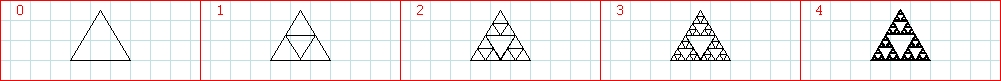 Sierpinski trokut nastaje tako da se početnom jednakostraničnom trokutu upiše jedan manji jednakostranični trokut koji će početni trokut podijeliti na 4 jednakostranična trokuta. Srednji trokut (jedini kojemu treći vrh "gleda" prema dolje) se izbaci, a sa preostala 3 trokuta se nastavlja iterativni postupak. Svakom od ta 3 manja trokuta se ponovno upisuje jednakostranični trokut koji ih svakog dijeli na 4 nova trokuta i ponovno se izbacuje srednji trokut iz svakog. Dakle, u svakom koraku iterativnog postupka od jednakostraničnog trokuta odbacujemo njegov središnji, također jednakostranični, trokut. U nekom (n+1)-vom koraku je dužina stranice trokuta 2 puta manja nego u n-tom koraku, a svaki od trokuta se kopira u 3 svoje manje kopije. Dakle, r = 2, a m = 3.